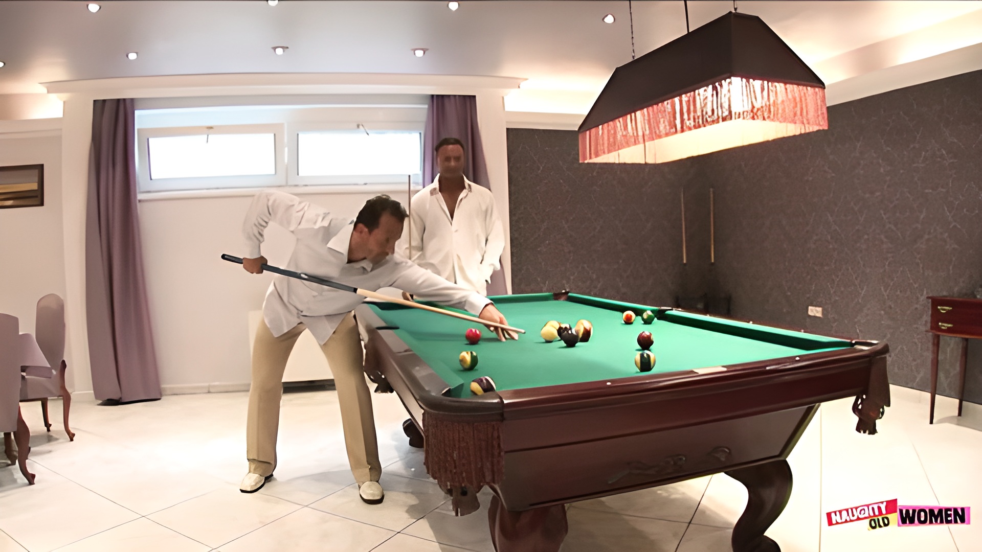 Racy blonde loses a game of pool and gets DPed by her two friends