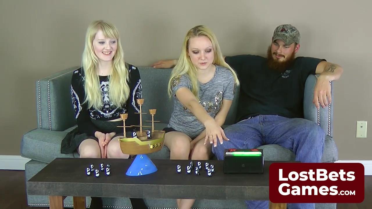 Two hot pirates strip penguins on a boat for a lost game bet